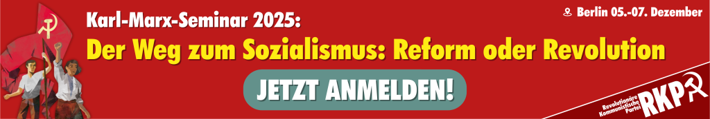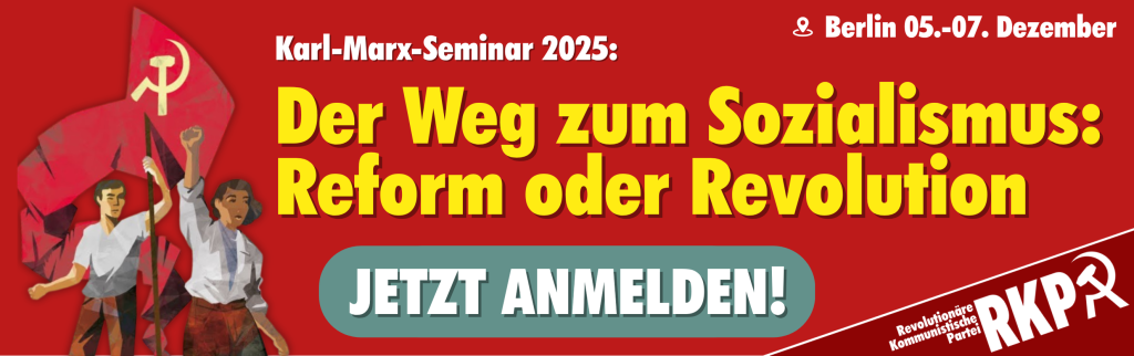 Die Revolutionäre Kommunistische Partei lädt wieder zum Karl-Marx-Seminar ein. Das leitende Thema ist: Der Weg zum Sozialismus – Reform oder Revolution? Eine Frage so alt wie die Arbeiterbewegung selbst und doch aktueller denn je.